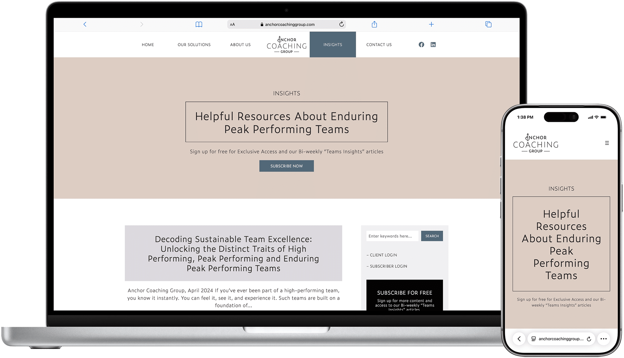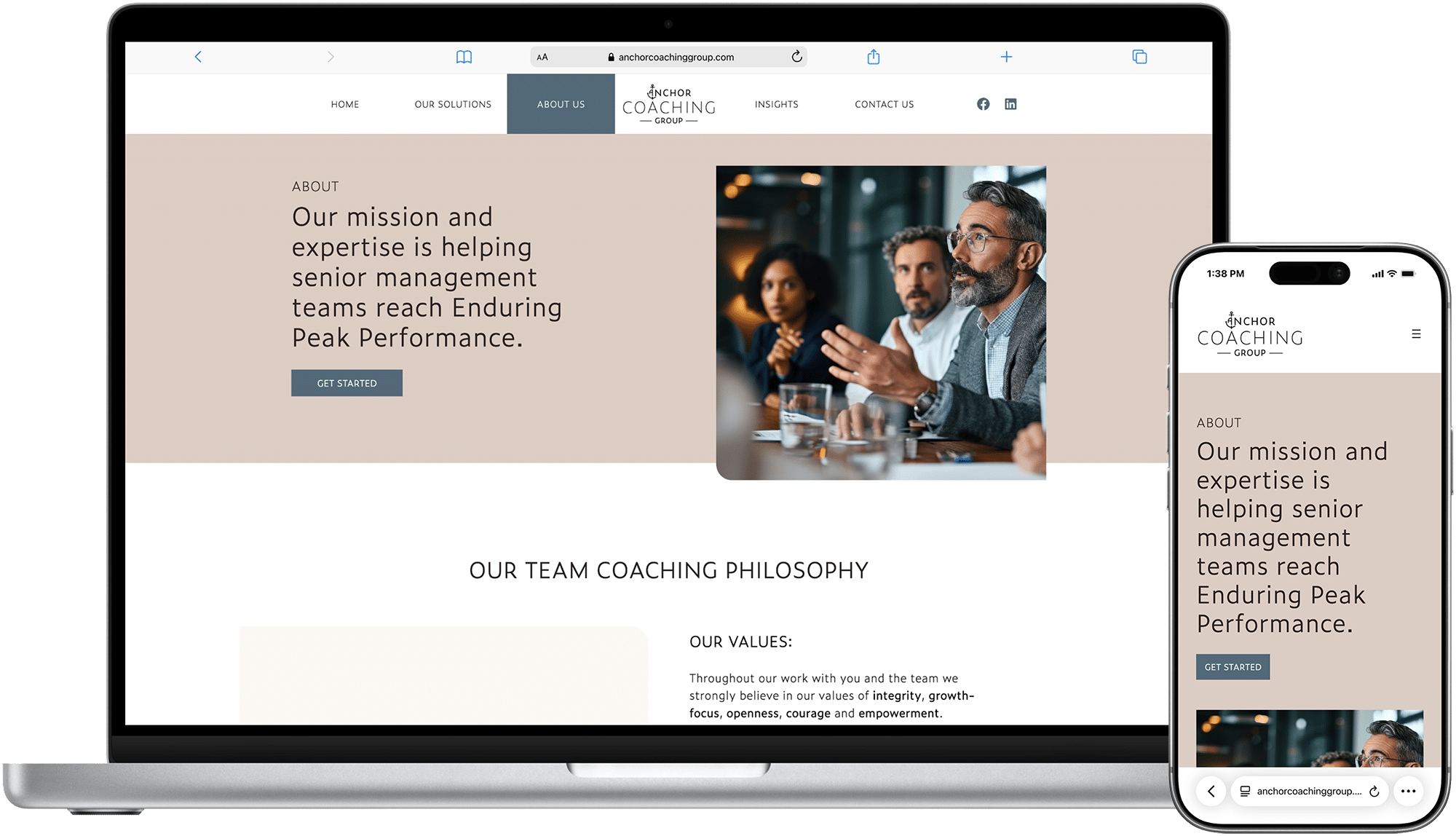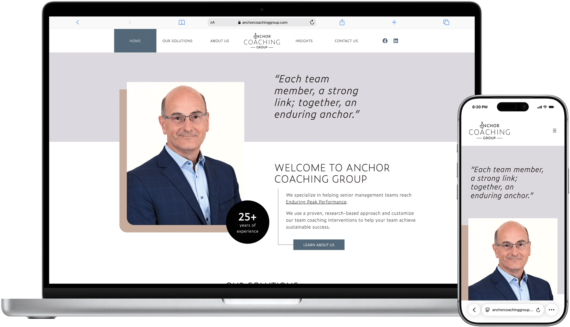 Complete brand identity and web presence for a senior management coaching firm. Sophisticated design establishing credibility and trust, with membership platform for subscriber-exclusive blog content.