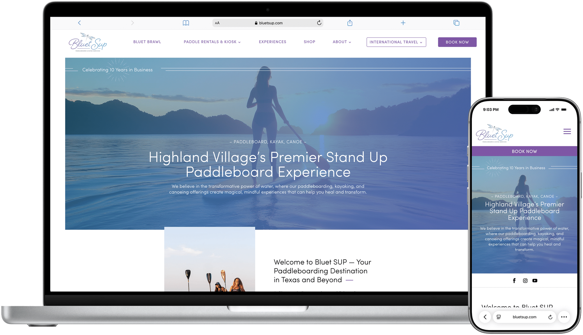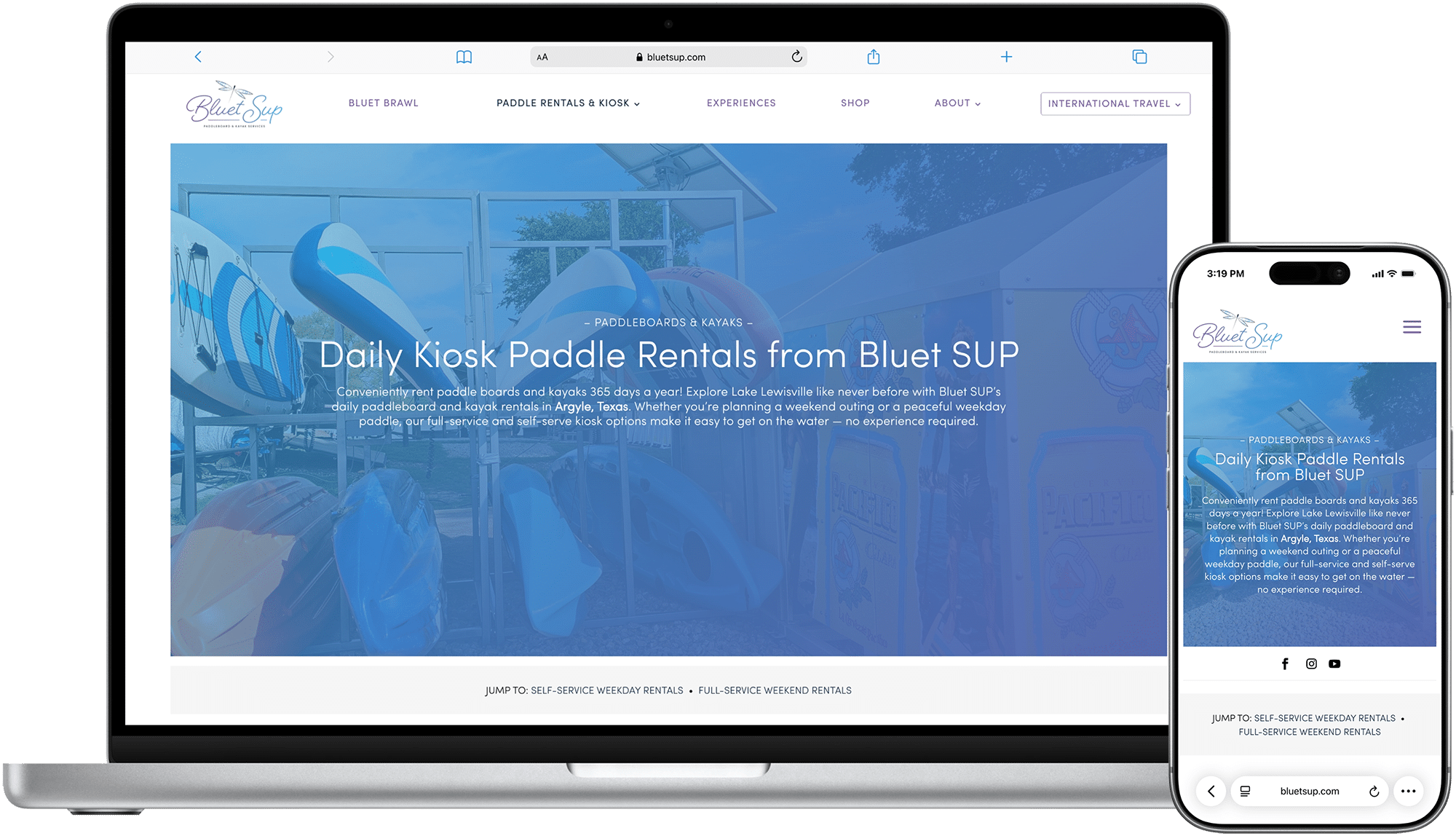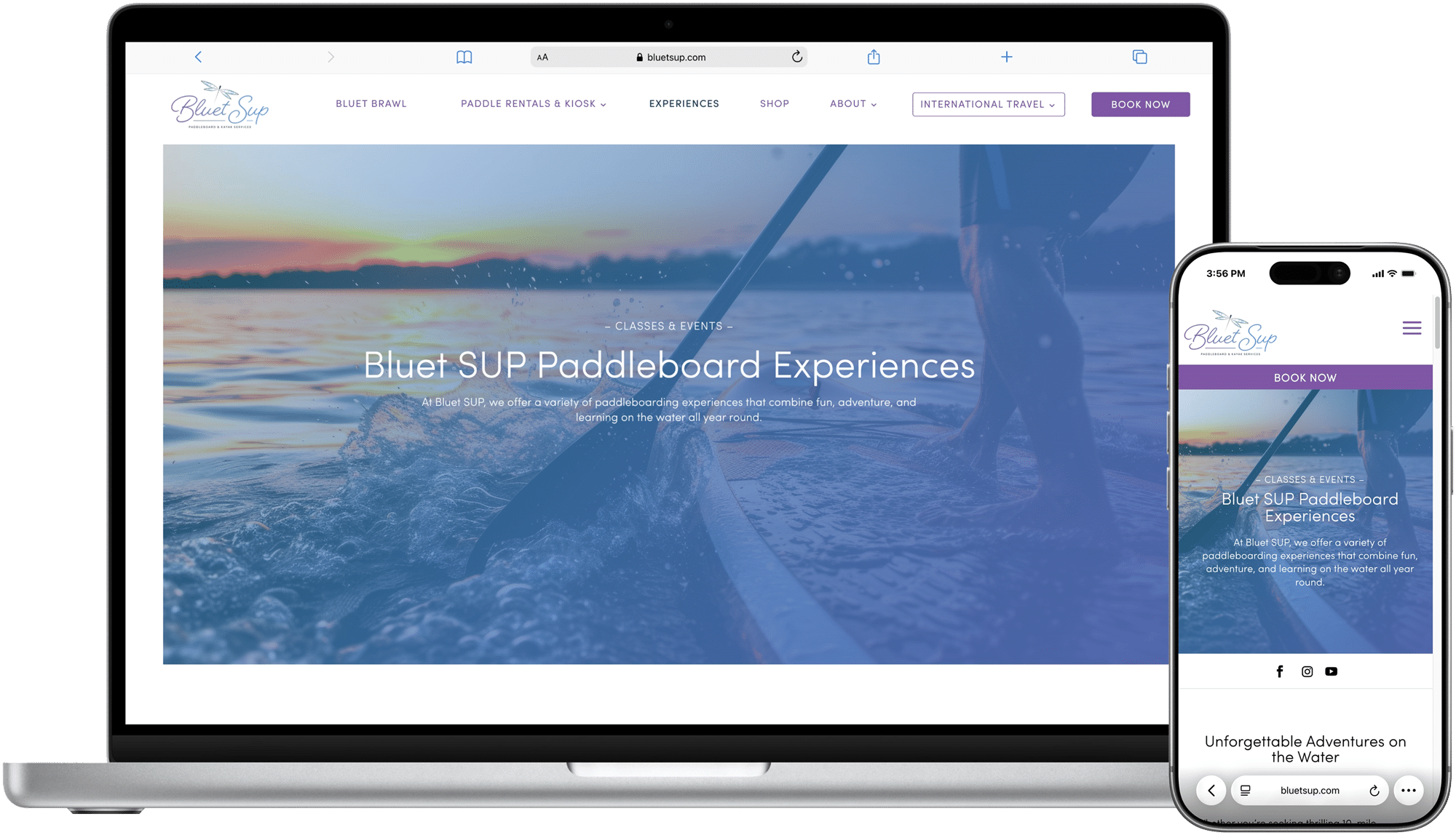 Website for paddleboard rentals, events/experiences, and international SUP tours. Modern, minimal design highlighting destination experiences while maintaining the brand's adventurous spirit.