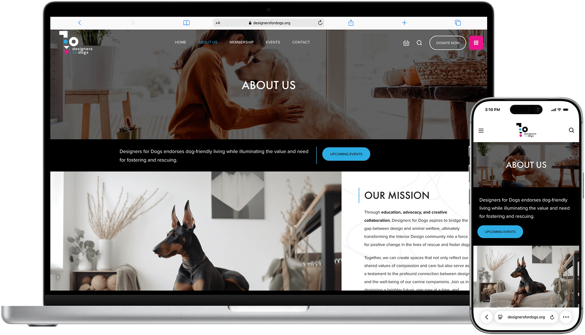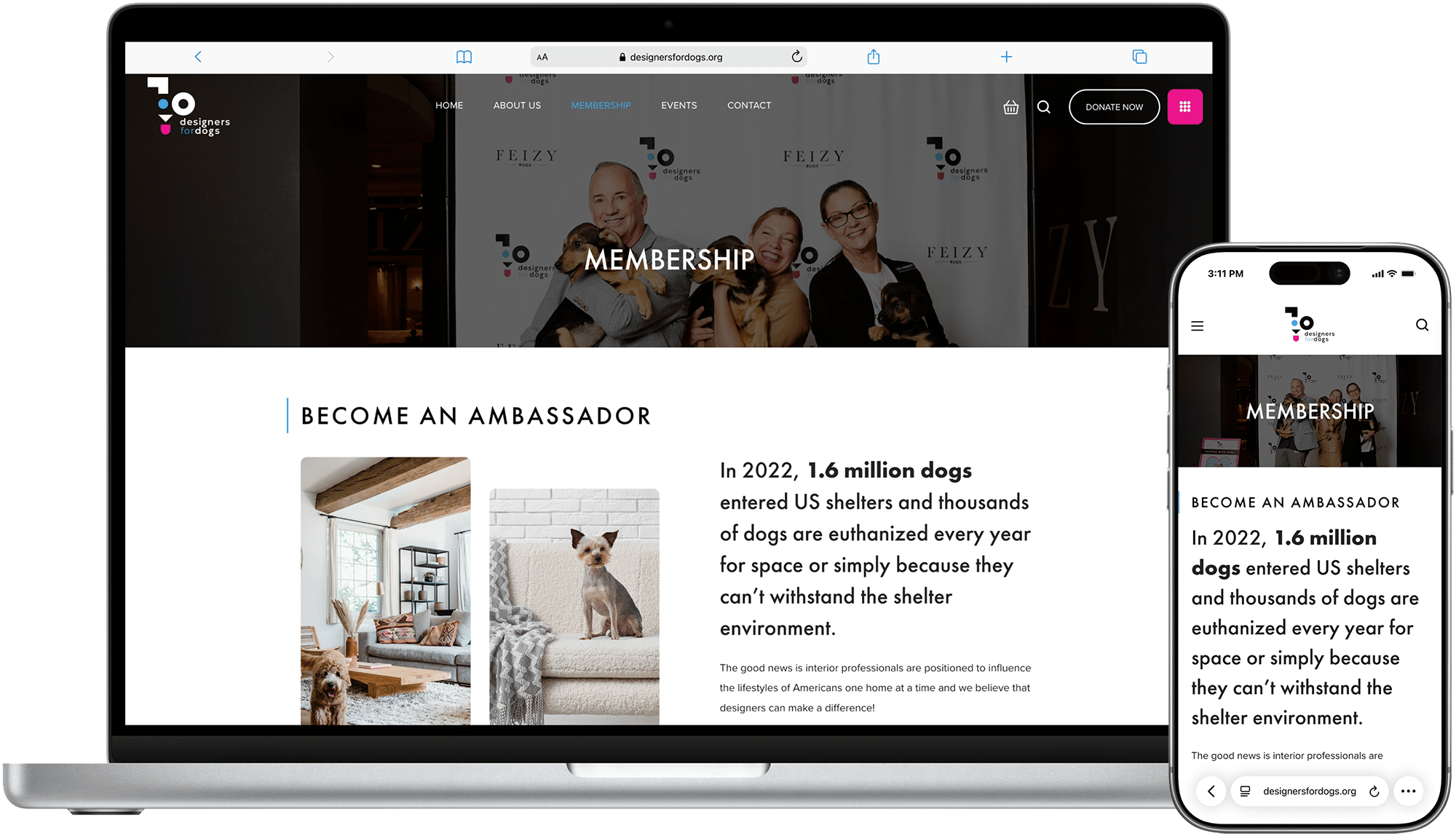 A nonprofit bridging interior design and animal welfare through education and advocacy. Web platform with e-commerce for memberships and donations, plus comprehensive print and event materials.