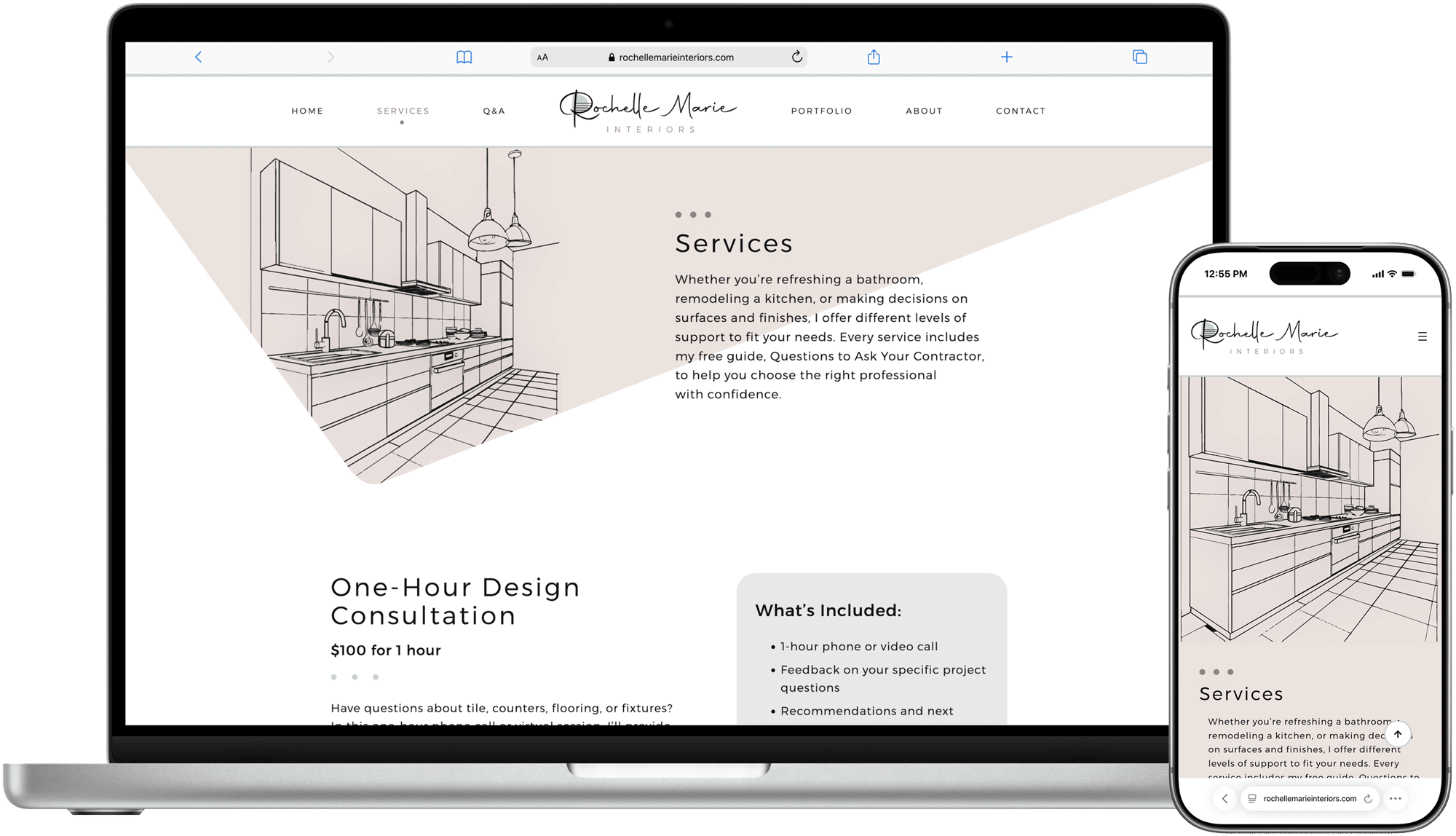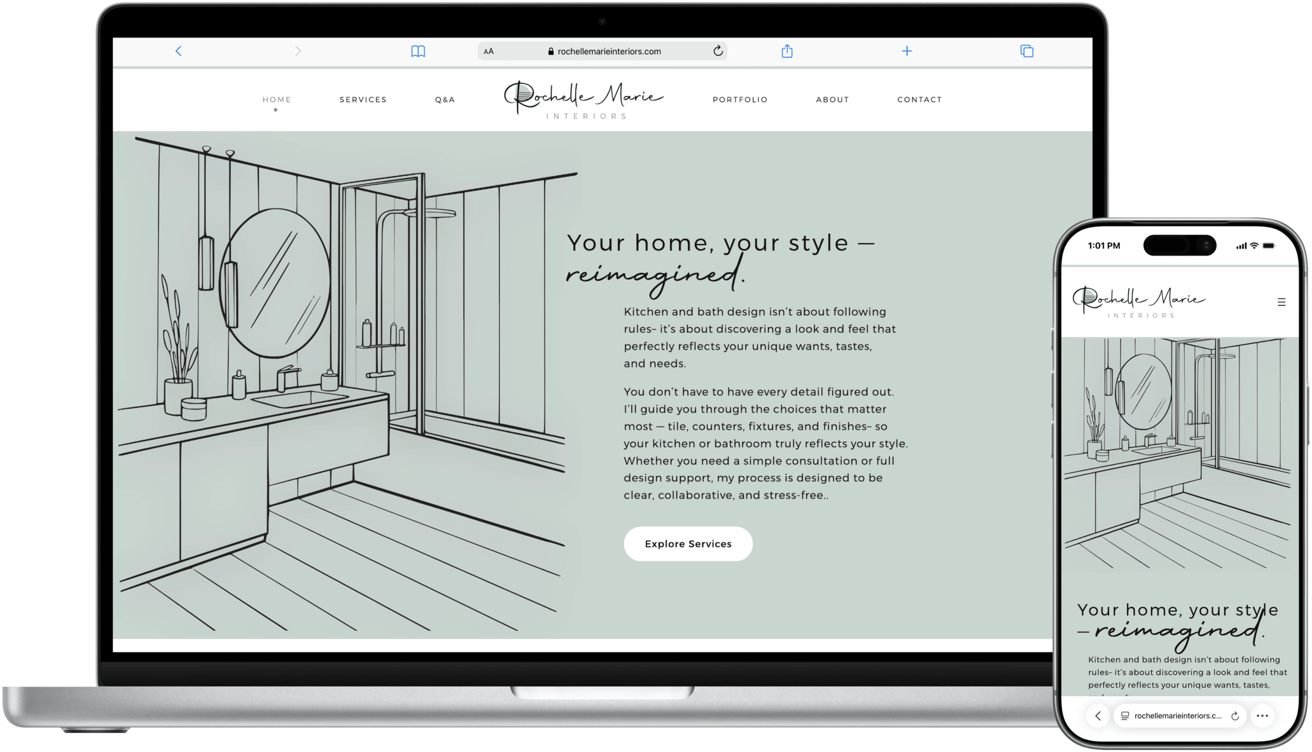 Sophisticated brand identity and website for an interior design studio specializing in kitchen and bath design, featuring custom illustration and elegant, minimal aesthetic.