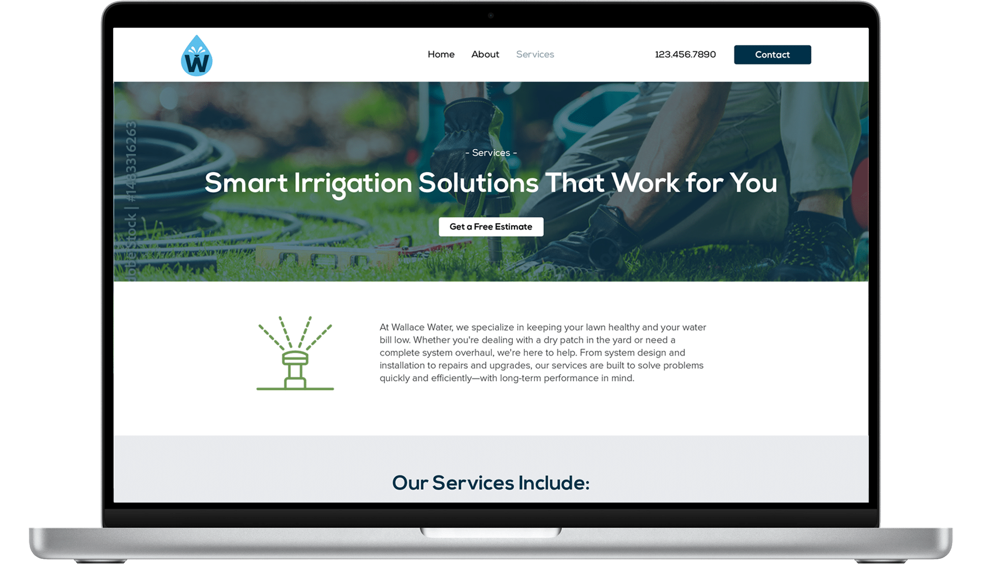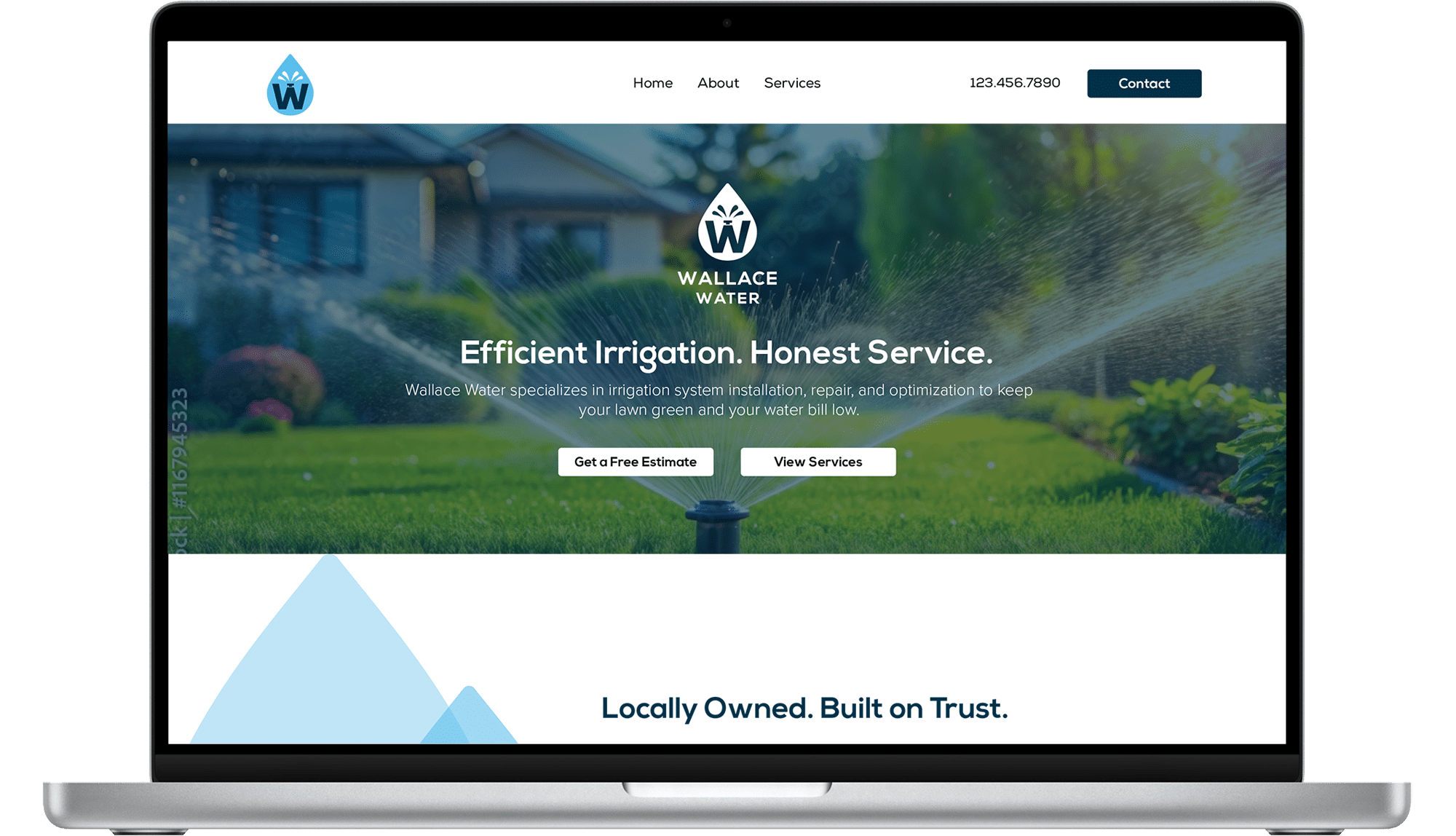 Brand identity and website design for an irrigation services company. Logo design incorporating water droplet iconography, color system, and clean, professional website design emphasizing trust and local expertise.